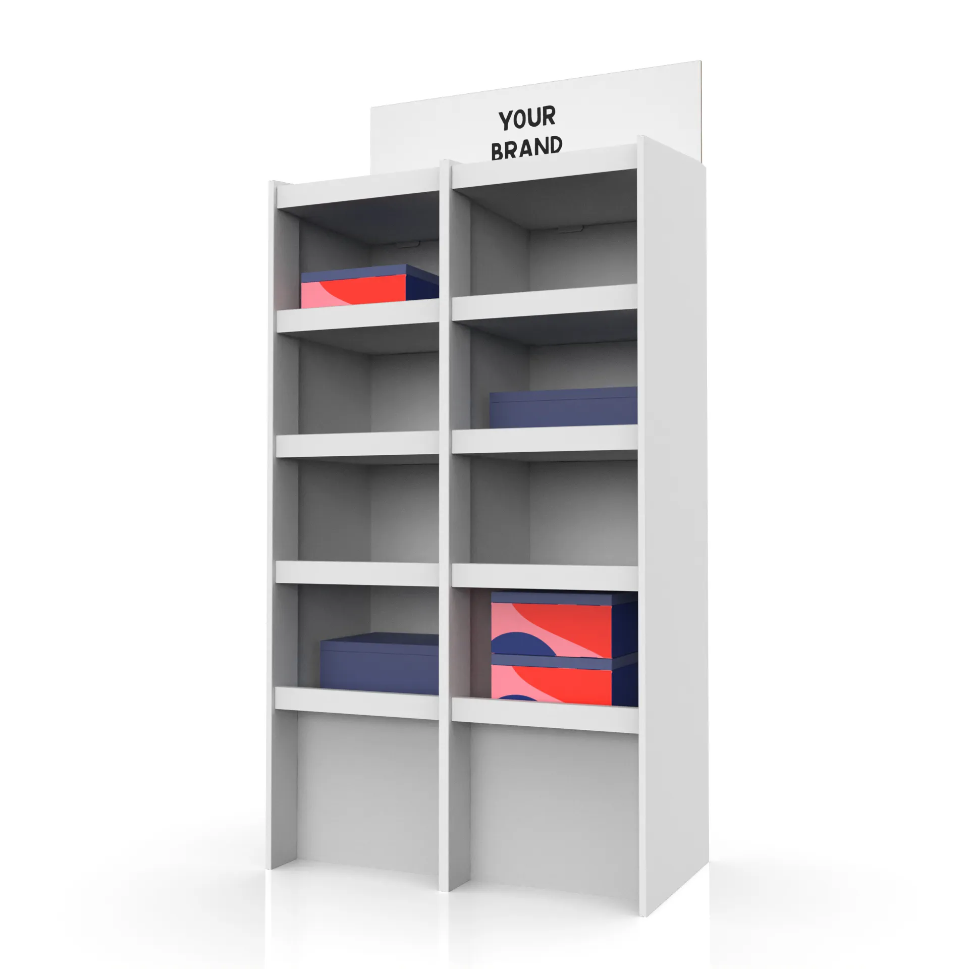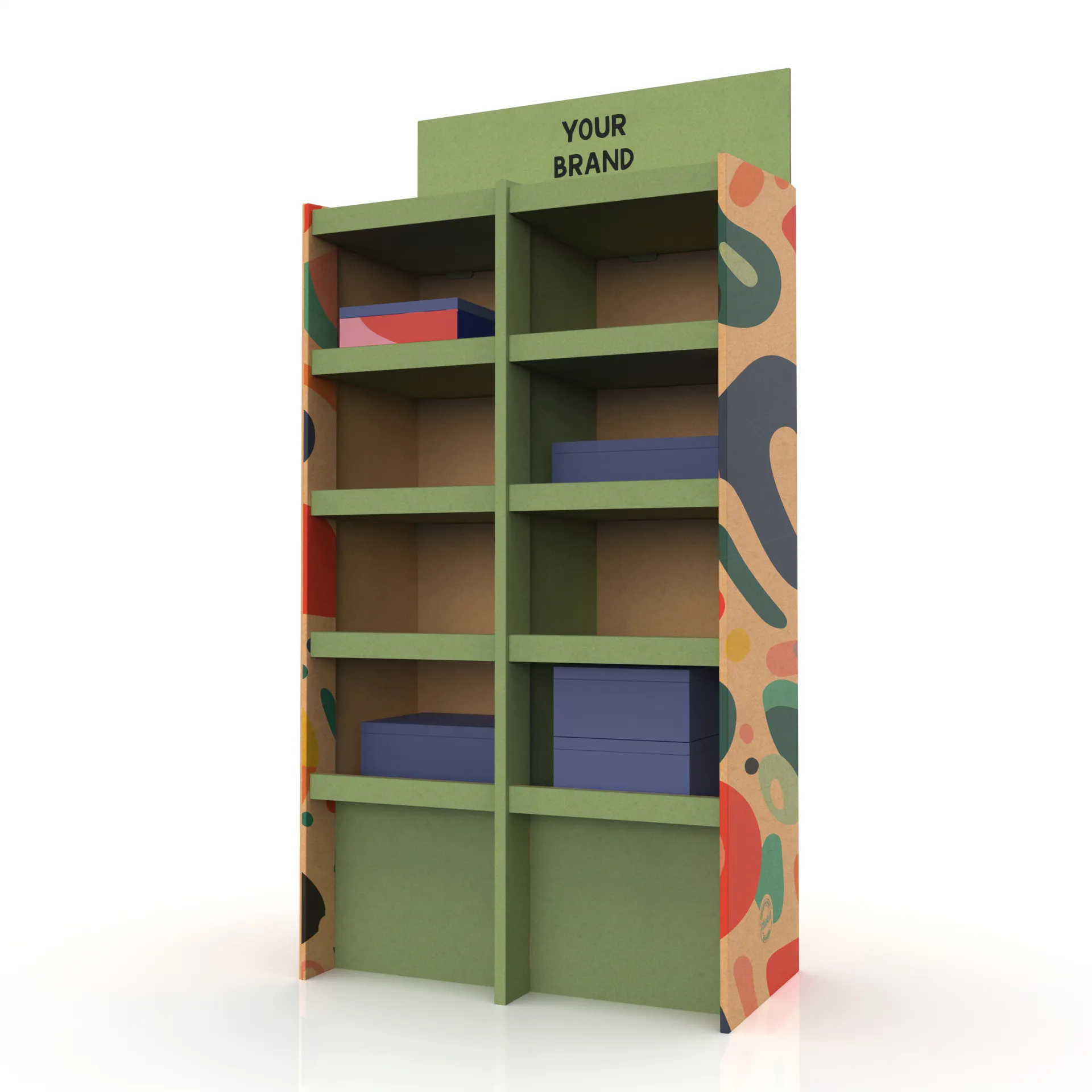 Display-ul din carton Border XXL are 5 polițe foarte încăpătoare, ce pot fi poziționate în funcție de necesitate.