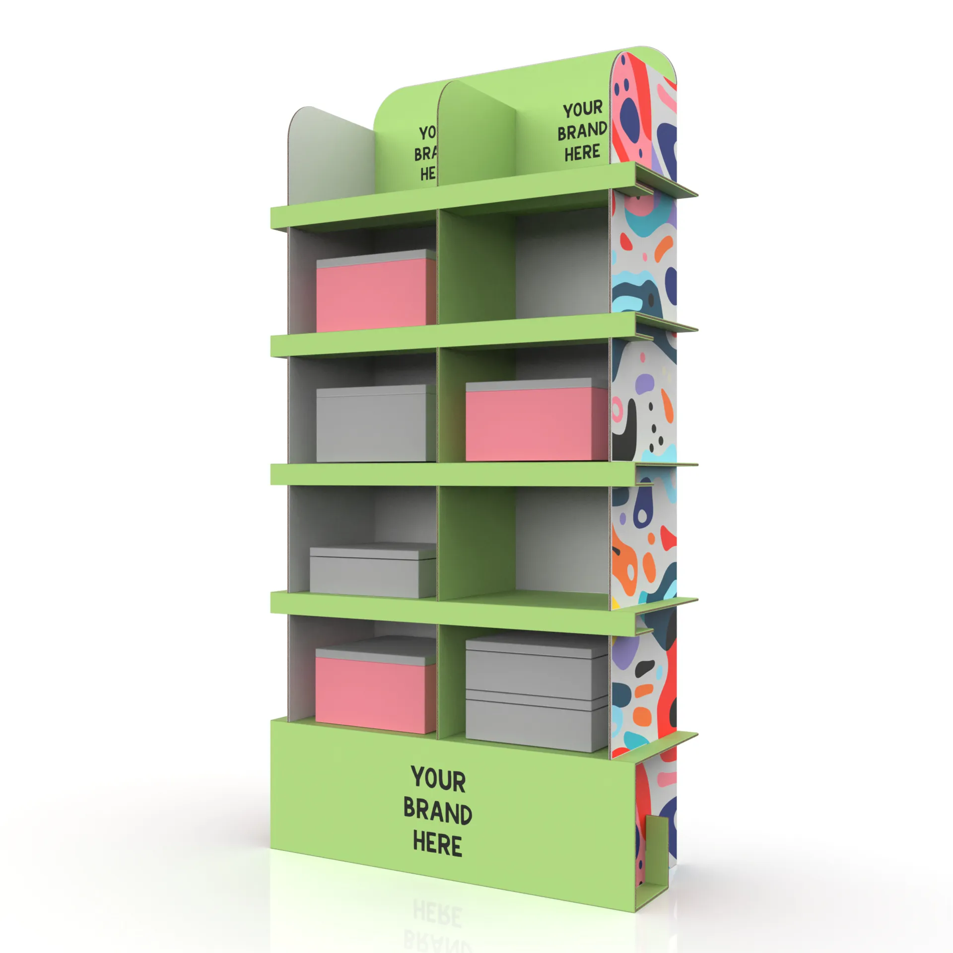 Display-ul modular din carton La Etaj XXL oferă 5 polițe încăpătoare. Acesta permite extinderea prin combinarea mai multor module pentru un spațiu de depozitare mai mare. Poate fi personalizat integral prin orice tip de imprimare, iar montarea se face simplu și rapid, doar prin îmbinare.